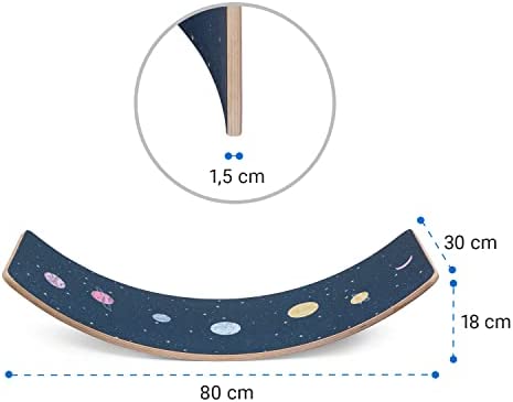 Adecuado para niños a partir de 3 años bajo la supervisión de los padres Favorece el equilibrio y la motricidad Material de la mesa: madera contrachapada de arce de 10 capas Superficie antideslizante para un agarre seguro Protección del suelo con revestimiento de fieltro Forma curva Para usar descalzo y reduce el riesgo de resbalones