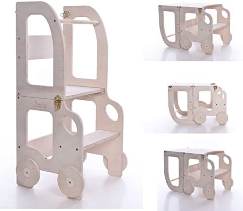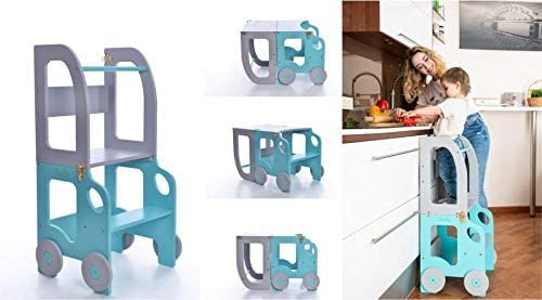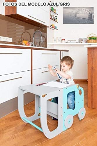 Torre de aprendizaje plegable para la cocina Montessori que se puede transformar fácilmente en escritorio y silla. Está diseñado y creado para aprender, cocinar, escalar, sentarse en la gran mesa familiar, comer y jugar. Y lo más interesante es que esta torre de aprendizaje de cocina es vista por los niños como un juguete mientras aprenden.